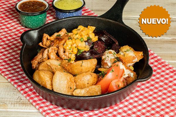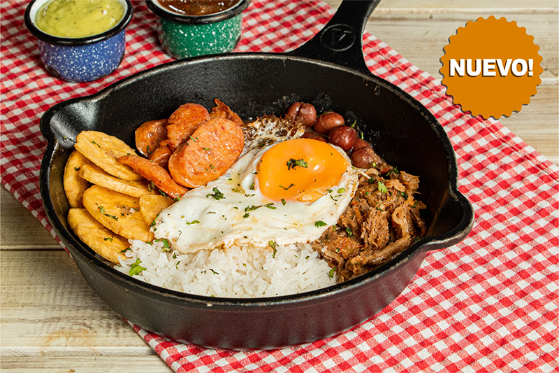 Carne de res desmechada, chorizo salteado a la plancha, huevo, frijoles, moneditas de plátano, arroz y hogao.