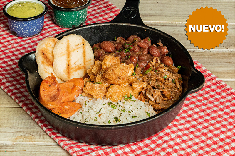 Carne de res desmechada, chorizo salteado a la plancha, chicharrón, frijoles, 2 mini arepitas de maíz, arroz y hogao.
